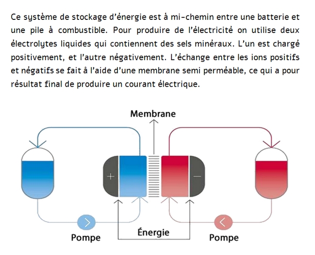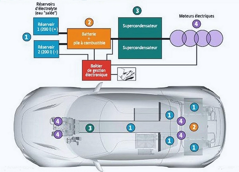 Mais il semblerait qu’une autre solution, ce que j’appelle LA VOITURE ÉLECTRIQUE À L’EAU SALÉE ait été complètement oubliée et je précise que je n’ai aucun intérêt même lointain avec les possesseurs des brevets concernant cette technologie, solution qui consisterait à faire rouler des voitures grâce à des électrolytes liquides composés d’eau et de sels spéciaux placés dans 2 réservoirs, un réservoir étant chargé positivement, l’autre négativement, L’ÉLECTRICITÉ pour alimenter les moteurs étant produite par les échanges des ions positifs et négatifs provenant des 2 réservoirs lors d’une réaction chimique. L’avantage d’un tel système serait bien sûr une « recharge » aussi rapide que pour une voiture thermique, grâce à un système de pistolet de pompe à 2 embouts et une grande autonomie puisque malgré une consommation élevée de liquide (environ 30 l/100 km) elle pourrait être supérieure à 1.000 kilomètres en remplissant 2 grands réservoirs de 150 à 200 litres dont le poids total une fois le plein effectué atteindrait 400 kilos et serait donc assez proche par exemple de celui des batteries des Tesla qui pèsent entre 430 et 600 kg. Même si ce n'est pas vraiment important les vitesses maximales estimées dépasseraient les 200 km/h et comme pour les voitures électriques que nous connaissons il n’y aurait pas d'émissions de gaz à effet de serre. Par contre j’ignore totalement quelle pourrait être la fiabilité d’un tel système nécessitant la circulation de l’électrolyte grâce à des pompes et des tuyauteries et quel serait le coût de fabrication des électrolytes liquides dont on pourrait faire le plein dans des stations services si cette technique venait un jour à se généraliser. Quant aux prix des véhicules de ce genre ils seraient sans doute aussi élevés que ceux des voitures électriques à batteries solides mais l’avantage d’une telle solution serait bien sûr de ne pas perdre de temps à « recharger » en s’émancipant des bornes de recharge. Même si pour les voitures électriques classiques un système d’échange a déjà été envisagé pour les batteries solides pour ainsi gagner du temps, en remplaçant sa batterie au lieu de la recharger quand elle est vide, il n’est pas du tout certain que cette solution puisse se concrétiser un jour puisque cela nécessiterait une harmonisation des batteries des voitures électriques de toutes les marques avec qui plus est l’obligation de les rendre facilement accessibles, la voiture électrique à l’eau salée semblant être une bien meilleure solution puisqu'elle ne nécessiterait que des pleins d’électrolytes liquides que l'on pourrait effectuer rapidement de temps en temps.