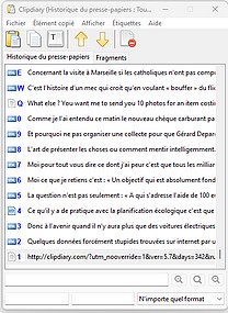 Même si sous Windows 10 ou 11 l’on peut accéder au presse-papier système grâce aux touches « Logo Windows + V », je vous propose d’utiliser le logiciel gratuit et en français Clipdiary, beaucoup plus complet et très pratique. Une icône placée dans la zone de notification tout à droite de la barre des tâches permet de consulter un historique contenant des dizaines voire des centaines d’éléments copiés, y compris des images, avec les dates et le nom des applications à partir desquelles ils ont été créés. |