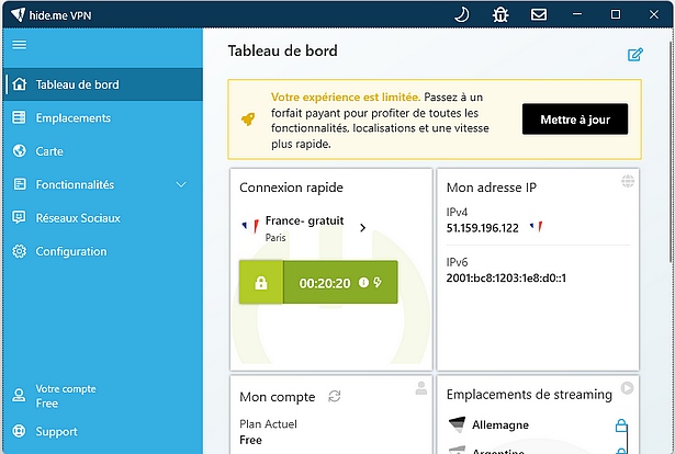 La version gratuite de HIDE.ME VPN que l’on ne peut utiliser que sur un seul appareil offre depuis peu une bande passante illimitée (10 Go par mois auparavant), ne conserve aucun journal de l’activité, n’impose aucune publicité et permet de choisir parmi 7 emplacements (Allemagne, États-Unis, Finlande, France, Pays-Bas, Royaume-Uni et Suisse). D’origine allemande mais basé en Malaisie ce logiciel est assez bien classé dans les tests mais propose des tarifs assez élevés d’où peut-être pour mieux se faire connaître cette version gratuite « améliorée » qui, si elle ne permet pas d’accéder à certaines plateformes de streaming comme Netflix, offre la même protection et le même cryptage que les plans payants, la seule différence étant une vitesse peut-être un peu moins élevée mais selon moi acceptable par rapport par exemple à celle d’un autre VPN gratuit que j’ai essayé et qui était complètement « saturé ». |