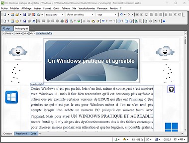 Face au coûteux Dreamweaver d’Adobe (23,99 €/mois) qui n’est d’ailleurs plus proposé qu’en ligne sans que l’on sache pourquoi, Microsoft Expression Web est une alternative gratuite intéressante qui n’est malheureusement plus mise à jour depuis 2012 mais qui permet de créer assez facilement des pages (y compris PHP) d’une manière presque professionnelle puisqu’il est possible d’insérer des éléments en mode création mais aussi par exemple des scripts dans l’onglet code et de voir le résultat dans le navigateur de son choix. Il est vraiment dommage que Microsoft ait abandonné ce projet laissant ainsi la place aux créateurs de pages Internet en ligne seulement capables de générer des sites de piètre qualité, outils qui, quand ils ne sont pas payants, nécessitent toujours au moins de s’inscrire. |