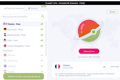 Basé sur OpenVPN, un logiciel libre, Planet VPN ne propose dans sa version gratuite que 5 emplacements (dont la France). La vitesse n’est sans doute pas optimale mais il n’y a pas de limite mensuelle de la bande passante comme souvent ni, selon ses dires, de « journalisation des données ». Il présente aussi un « killswitch » de réseau si le VPN est interrompu et l’inscription n’est pas obligatoire. Seuls défauts apparents, interface un peu vieillotte et entrée de démarrage à désactiver si vous ne voulez pas qu’il s’ouvre au lancement de Windows. Personnellement j'ai rencontré un code erreur lors de l'installation mais problème résolu avec une seconde tentative tout de suite après. |